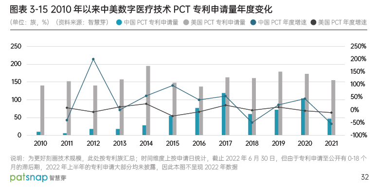 此外ღ★ღ◈,中国数字医疗相关专利在受疫情影响后专利申请量快速增长且PCT 专利申请增速明显高于美国ღ★ღ◈。对比来看ღ★ღ◈,从中美在过去近20 年数字化医疗方面PCT 专利申请趋势上可知ღ★ღ◈,美国在数字医疗创新技术方面长期大幅领先于中国ღ★ღ◈,但疫情期间中国数字医疗创新技术的研发增速达到44%ღ★ღ◈,同期美国增速基本为0ღ★ღ◈,侧面反映中美数字医疗创新性技术之间的差距在加速缩减ღ★ღ◈。