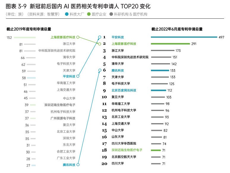 值得注意的是ღ★ღ◈,疫情以来ღ★ღ◈,中国科技大厂在AI医药研发领域加速入局ღ★ღ◈、持续提升技术能力ღ★ღ◈。截至2022年6月30日ღ★ღ◈,以2020年为界ღ★ღ◈,对比截至2019年底和截至2022年6月的中国AI 医药技术规模(按专利申请量计)前二十专利申请人ღ★ღ◈,医疗科技巨头平安快速形成领跑地位ღ★ღ◈,腾讯ღ★ღ◈、百度等互联网巨头也加快追赶ღ★ღ◈,三者的专利申请规模从8%的占比大幅跃升至28%ღ★ღ◈。